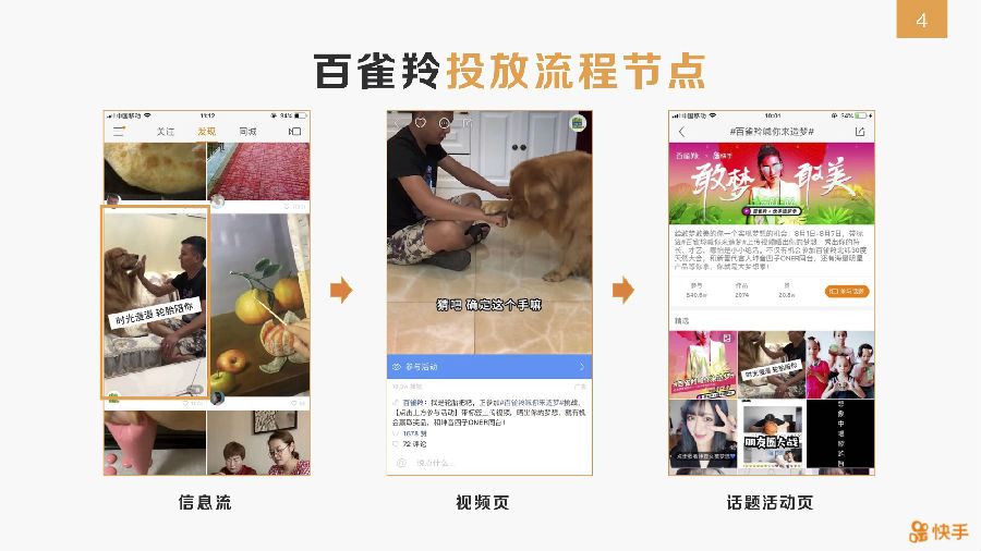 快快手是北京快快手科技有限公司開發(fā)的一款中國視頻分享手機應用,在中國用戶中擁有特別強大的用戶基礎,在其他市場也獲得了相當高的人氣,在谷歌Play和蘋果應用商店8個國家的“下載量最多”排行榜上高居榜首。在印度,這個應用程序被稱為零食視頻。在海外市場上常被稱為“葵”。它的主要競爭對手是豆印,在中國以外被稱為“抖音”??焓謎是一個社交網(wǎng)絡,提供短視頻和流行話題,發(fā)現(xiàn)有趣的短視頻,為社區(qū)提供錄音和生活視頻。全球擁有超過7億用戶,每天發(fā)布數(shù)百萬原創(chuàng)視頻。這是百雀羚的促銷活動,有助于吸引更多的顧客。圓桌可以通過在快手做廣告來幫助你打開中國市場。
